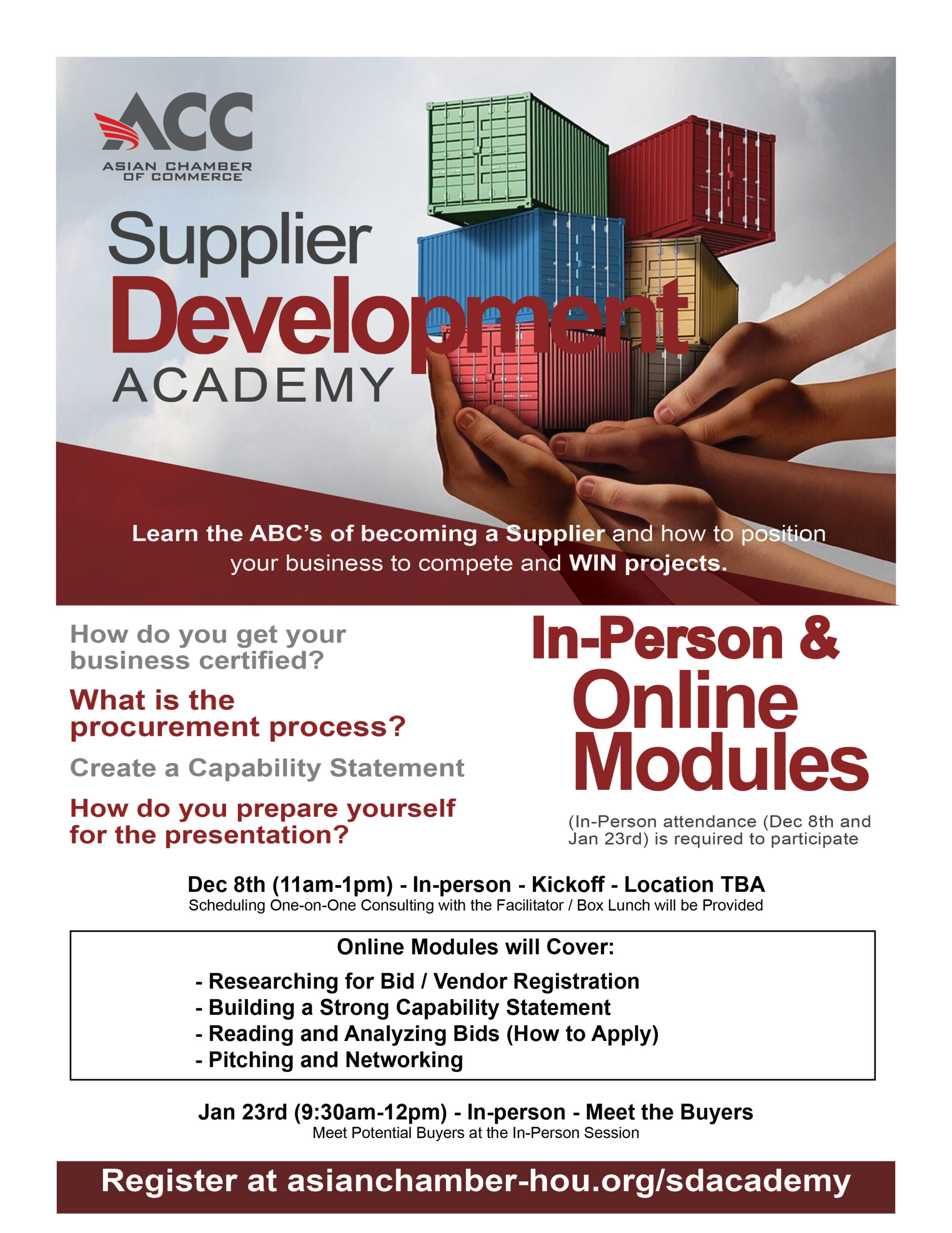 The Asian Chamber of Commerce is hosting our Supplier Development Academy to help your business win bids and learn what buyers look for in selecting suppliers. Be coached by decision makers from mayor corporations and the public sector in researching bids, learning the application process, and how to knock out a winning presentation. Meet Potential Buyers at the In-Person Sessions.