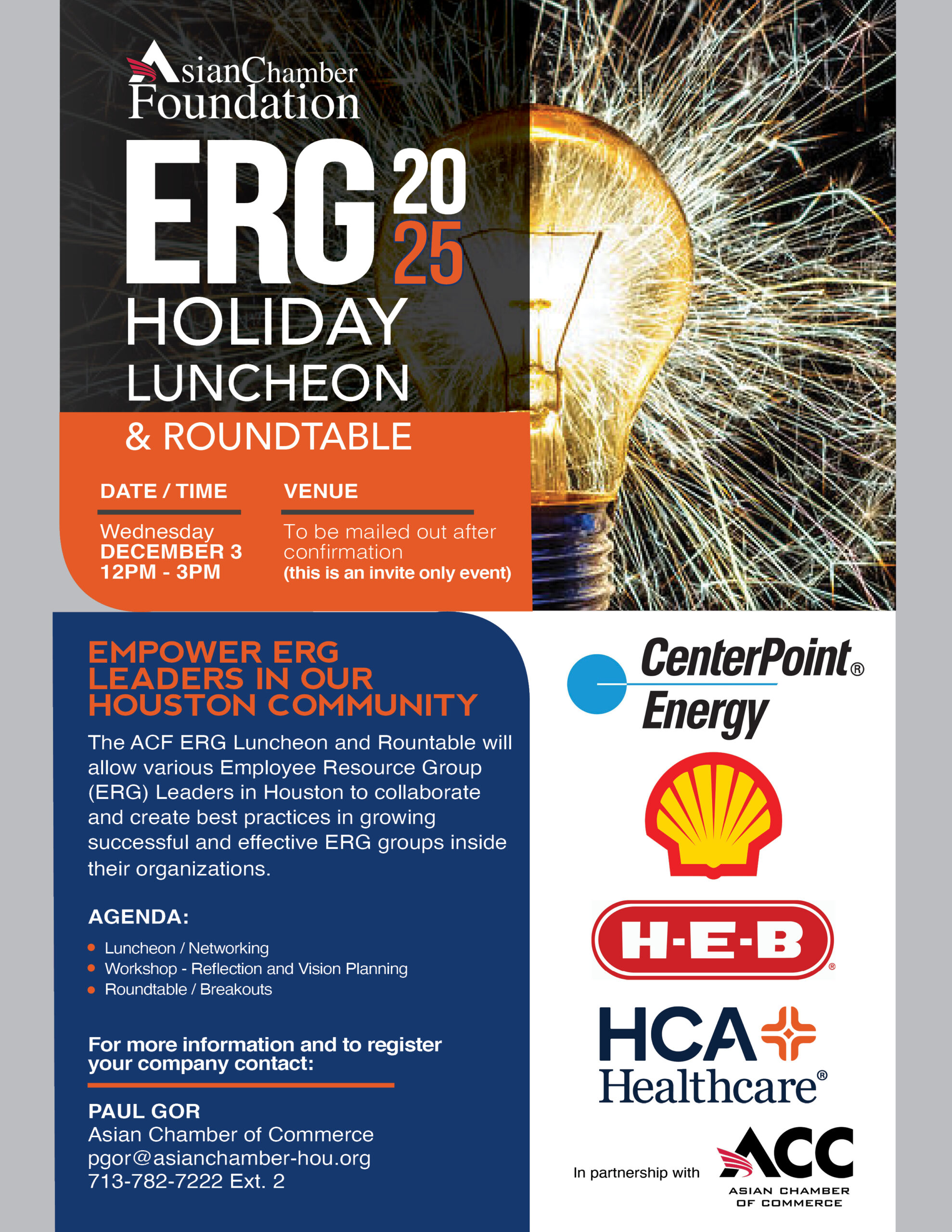 The Asian Chamber Foundation will host a holiday luncheon and roundtable event to allow various Employee Resource Group (ERG) Leaders in Houston to collaborate and create best practices in growing successful and effective ERG groups inside their organizations. This is an invite-only event specifically for ERG Leaders.