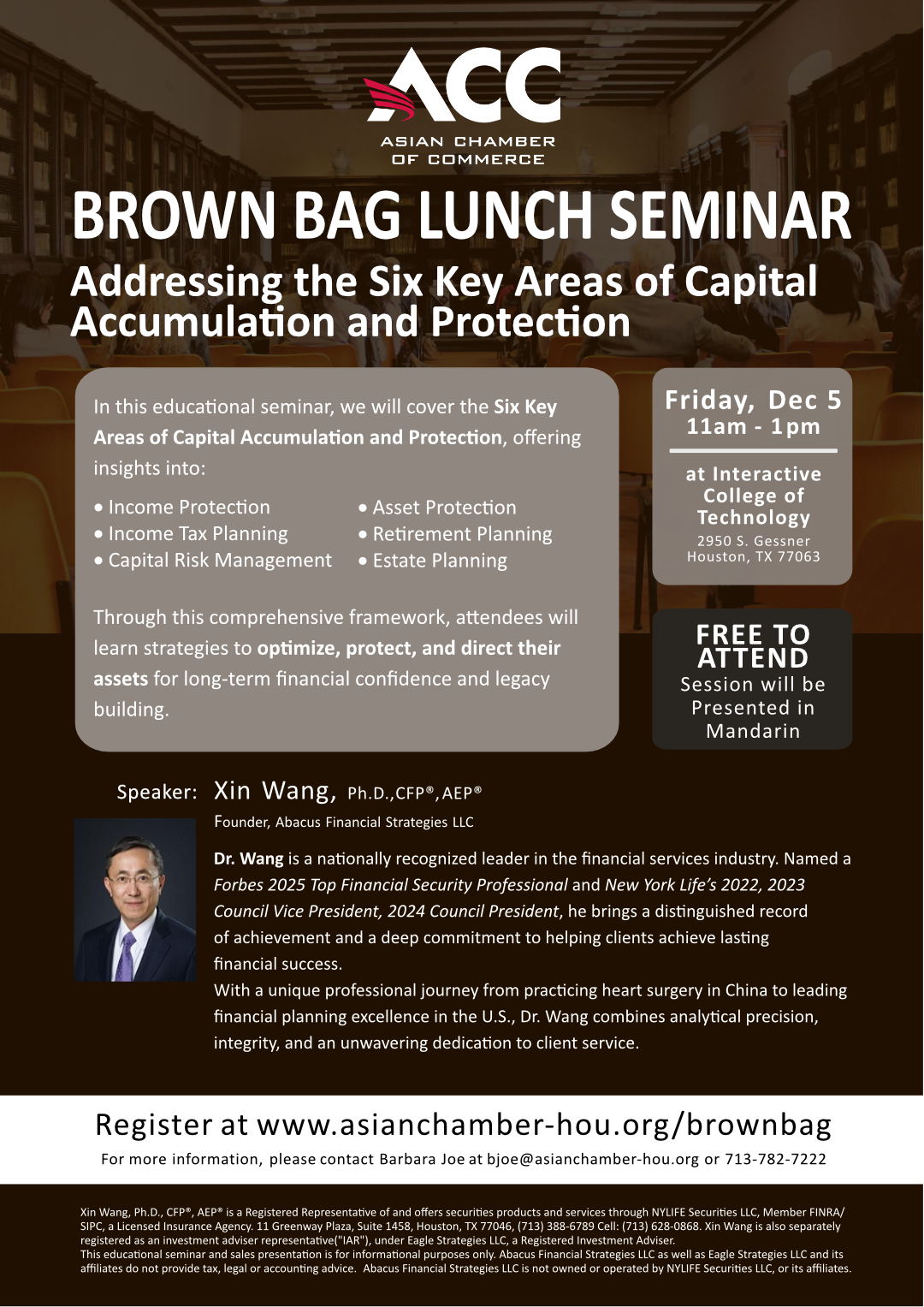 解决资本积累与保障的六大关键领域 我们荣幸地邀请您参加由 王欣博士(Xin Wang, Ph.D., CFP®, AEP®) 主讲的专题研讨会。王博士是 Abacus Financial Strategies LLC 的创始人,也是 纽约人寿附属机构 The Nautilus Group® 的 Nautilus Plus 成员。 王欣博士 是全美知名的金融服务行业领军人物,曾荣获 《福布斯》2025年顶级金融安全专业人士 称号,并担任 纽约人寿2022, 2023年度理事会副主席, 2024年度理事会主席。从中国的心脏外科医生到美国的财务规划专家,王博士将严谨的分析能力、诚信精神与专业热忱融入财富管理事业,致力于帮助个人与企业主客户实现长期财务稳健与传承目标。 在本次研讨会上,王博士将深入探讨 “资本积累与保障的六大关键领域”,内容涵盖: 无论您正在规划退休、经营企业,或是打造家族财富,本次研讨会都将为您提供实用的见解,增强您的长期财务信心。 主讲人:王欣博士(Xin Wang, […]