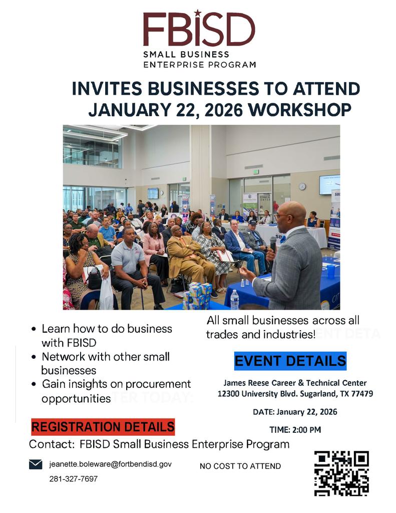 The FBISD Small Business Enterprise Program will host an in-person workshop for vendors and small businesses that are interested in doing business with the district.