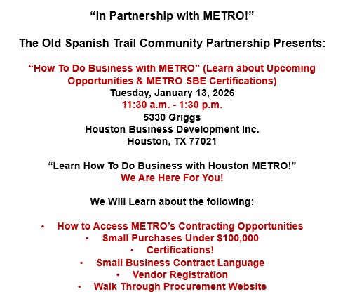 Join the City of Houston Office of Business Opportunity for the 2025 Meet the Buyer Procurement Forum & Business Expo on Thursday, December 11, 2025, at the George R. Brown Convention Center. This event connects small and certified firms with procurement agents, prime contractors, & partners to network and explore contracting opportunities.