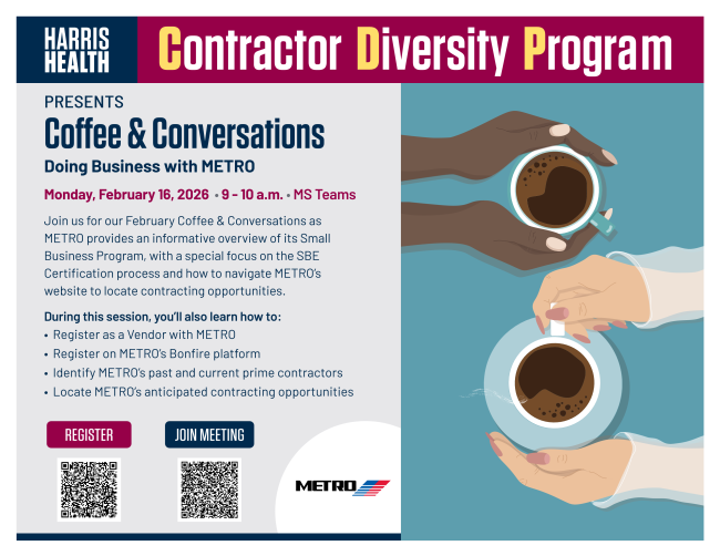 Join us for our February Coffee Conversations as METRO provides an informative overview of its Small Business Program, with a special focus on the SBE Certification process and how to navigate METROS website to locate contracting opportunities.