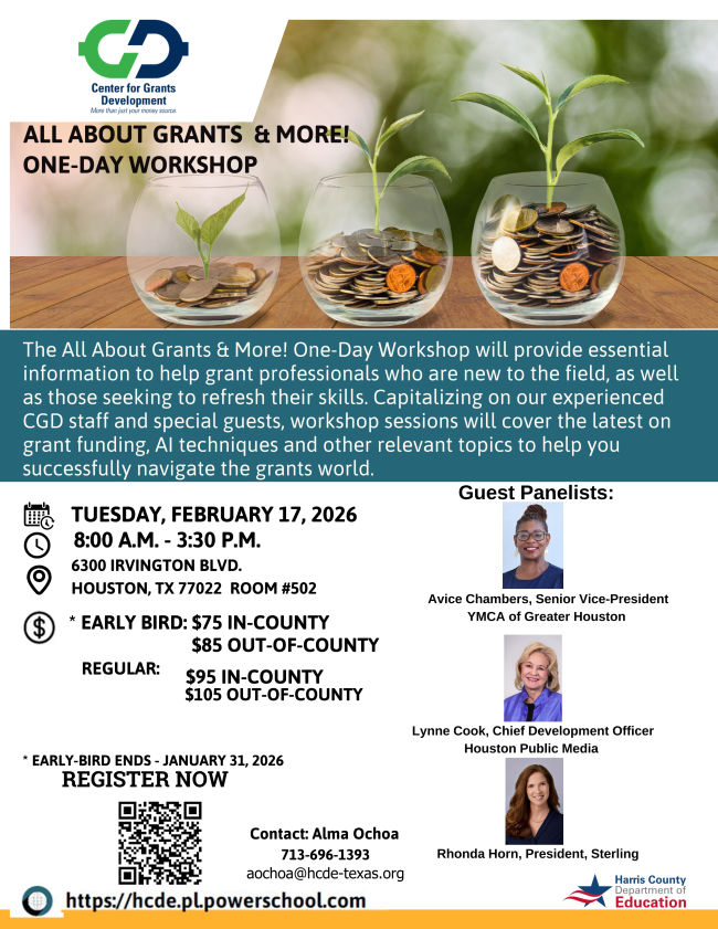 The All About Grants & More! One-Day Workshop will provide essential information to help grant professionals who are new to the field, as well as those seeking to refresh their skills. Capitalizing on our experienced CGD staff and special guests, workshop sessions will cover the latest on grant funding, Al techniques and other relevant topics to help you successfully navigate the grants world.