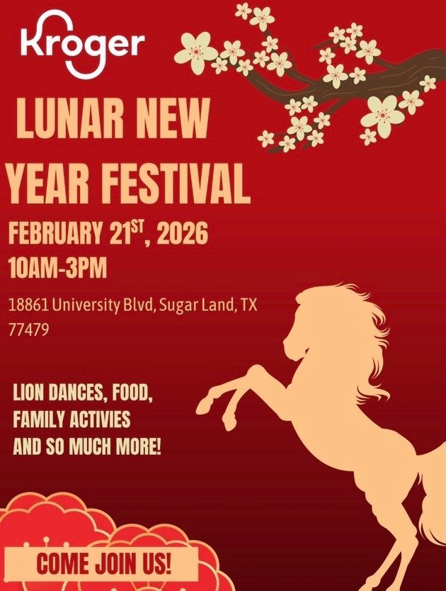 Come celebrate the Lunar New Year in Sugar Land on Feb 21st (10-3pm) at the Kroger South University Sugar Land Store (18861 South University Blvd., Sugar Land, TX 77479. There will be Lion Dances, Food, and Activities for the whole family to enjoy!