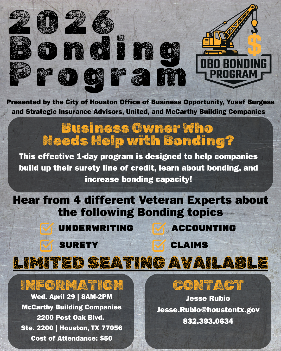 Is limited bonding capacity holding you back from major contracts? Join the City of Houston OBO and industry experts for an intensive 1-day workshop at McCarthy Building Companies Inc.