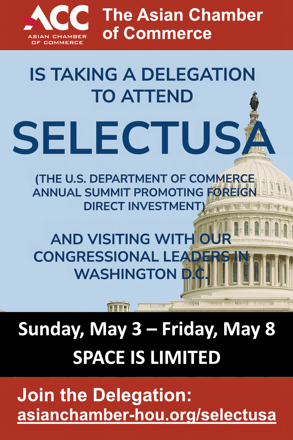 The Asian Chamber is leading a delegation to SelectUSA, the U.S. Department of Commerce’s annual summit promoting Foreign Direct Investment, with dedicated meetings on Capitol Hill with our Congressional leaders. Space is Limited.
