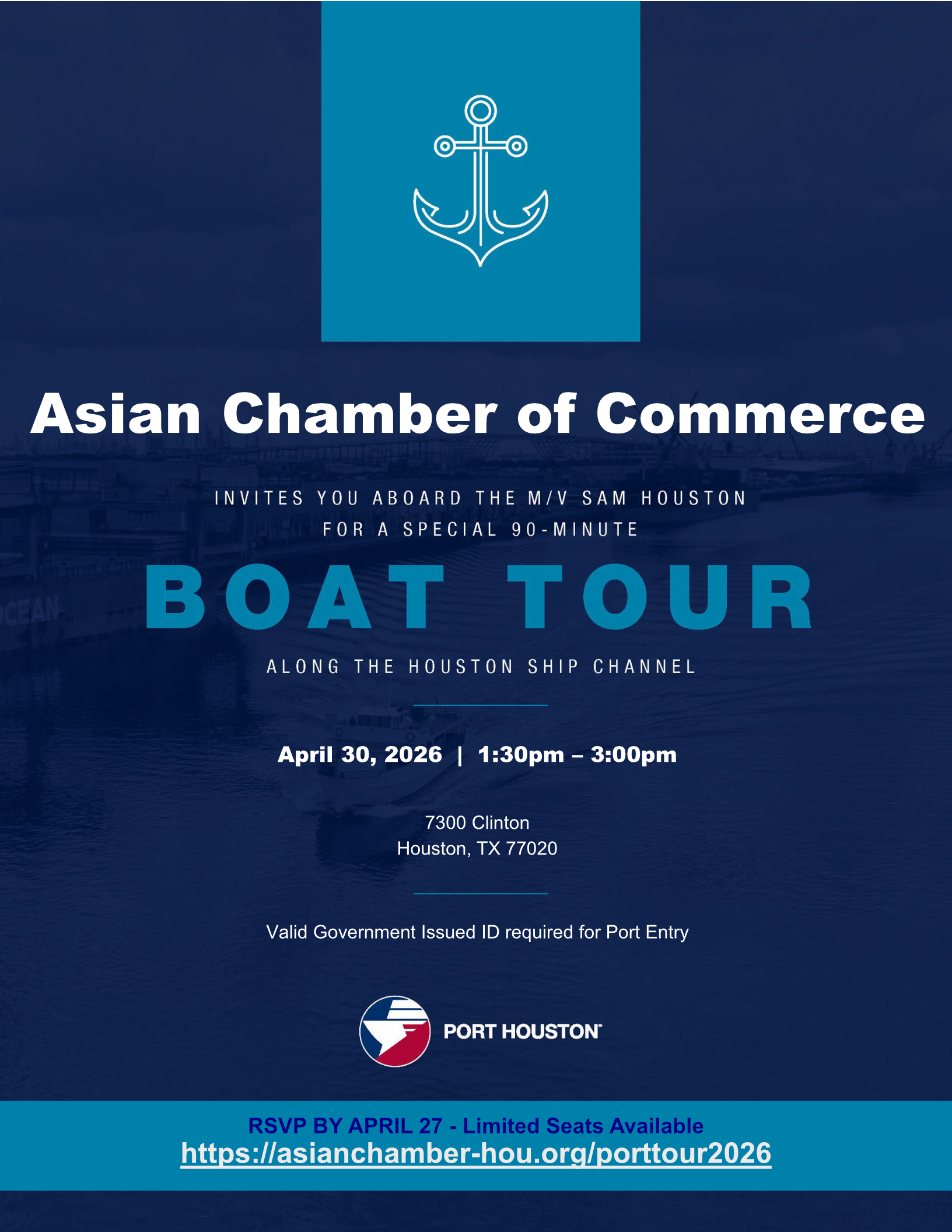 Join the Chamber in an exclusive Sam Houston Boat Tour along the Houston Ship Channel. This will be aboard the M/V Sam Houston Vessel. The tour will take 90 Minutes and a valid Government Issue ID will be required for Port Entry. Meet other Chamber Members and learn about what the Port Houston is doing to support international trade.