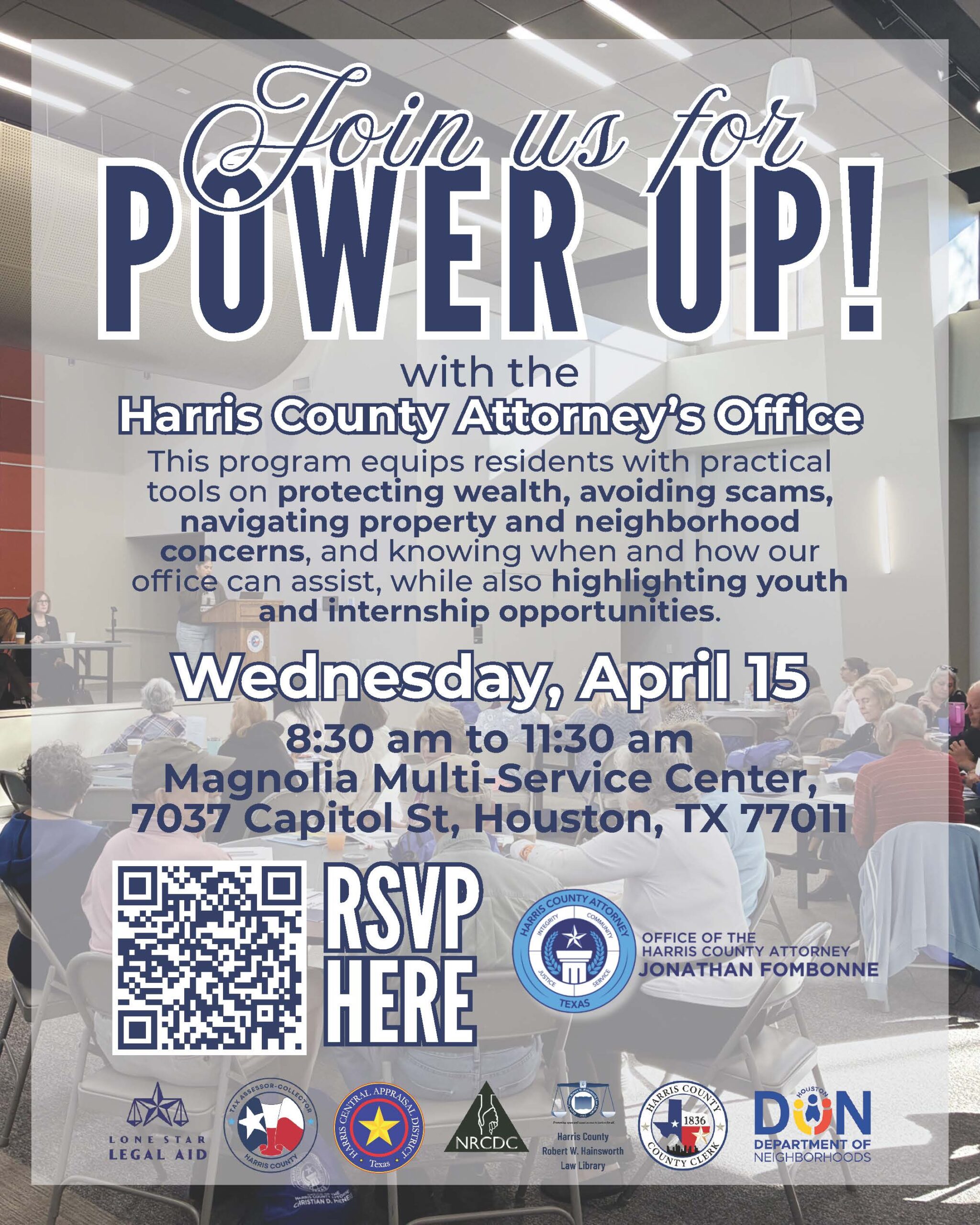 Power Up with the Harris County Attorney’s Office is an interactive workshop series hosted by the Harris County Attorney’s Office and is designed to connect residents with the Harris County Attorney’s Office. As the County’s Chief Civil Lawyer, the Office serves the community through eleven legal divisions addressing consumer protection, property and tax matters, senior and family support, environmental issues, scam prevention, compliance, and much more.