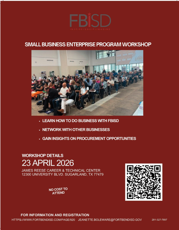 The Fort Bend ISD Small Business Enterprise Program (SBEP) invites all businesses interested in working with the district to attend an in-person SBEP Workshop on Thursday, April 23, 2026, at 2:00 p.m. The workshop will be held at the James Reese Career & Technical Center.