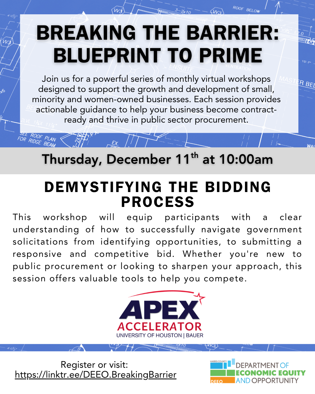 Harris County’s Department of Economic Equity and Opportunity (DEEO) is dedicated to driving local economic development and creating sustainable opportunities for Houston’s diverse business community. As part of this commitment, we’re excited to announce a series of impactful webinars and classes taking place this May! Each event is designed to help build capacity, strengthen competitiveness, and support your professional and business growth—particularly for those interested in contracting with Harris County.