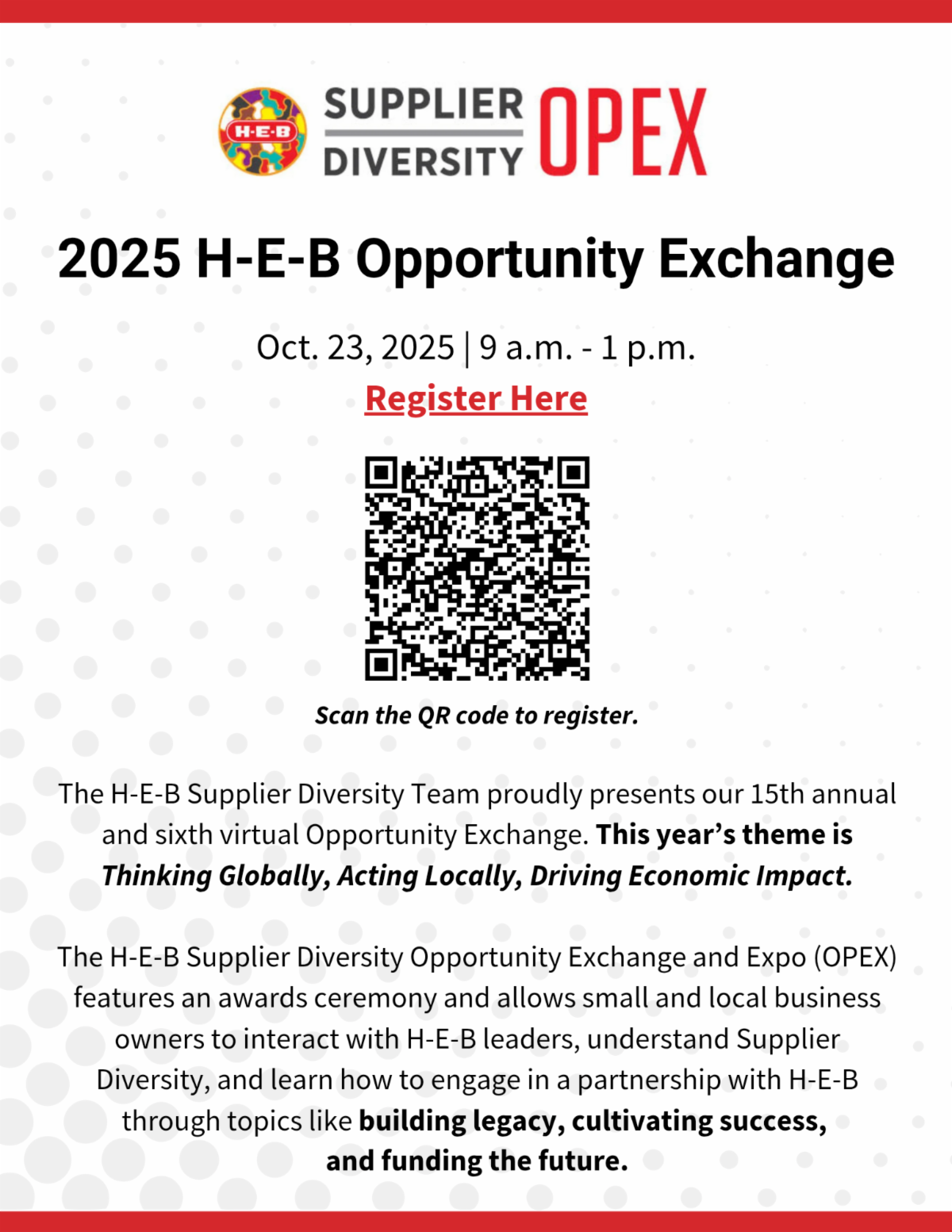 Welcome to the virtual edition of H-E-B's Opportunity Exchange event! Join us for for a virtual event filled with insightful discussions to foster collaboration, economic growth, and impact.