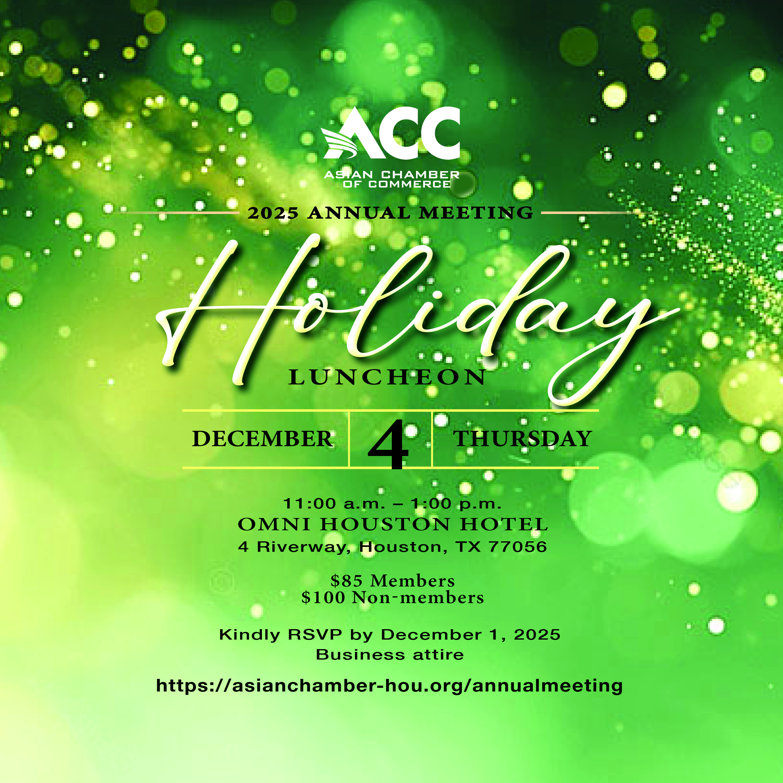 Celebrate the holidays at our Asian Chamber Annual Meeting and Holiday Luncheon. This is our last event of the year and introducing and voting in our new 2026 Board of Directors.