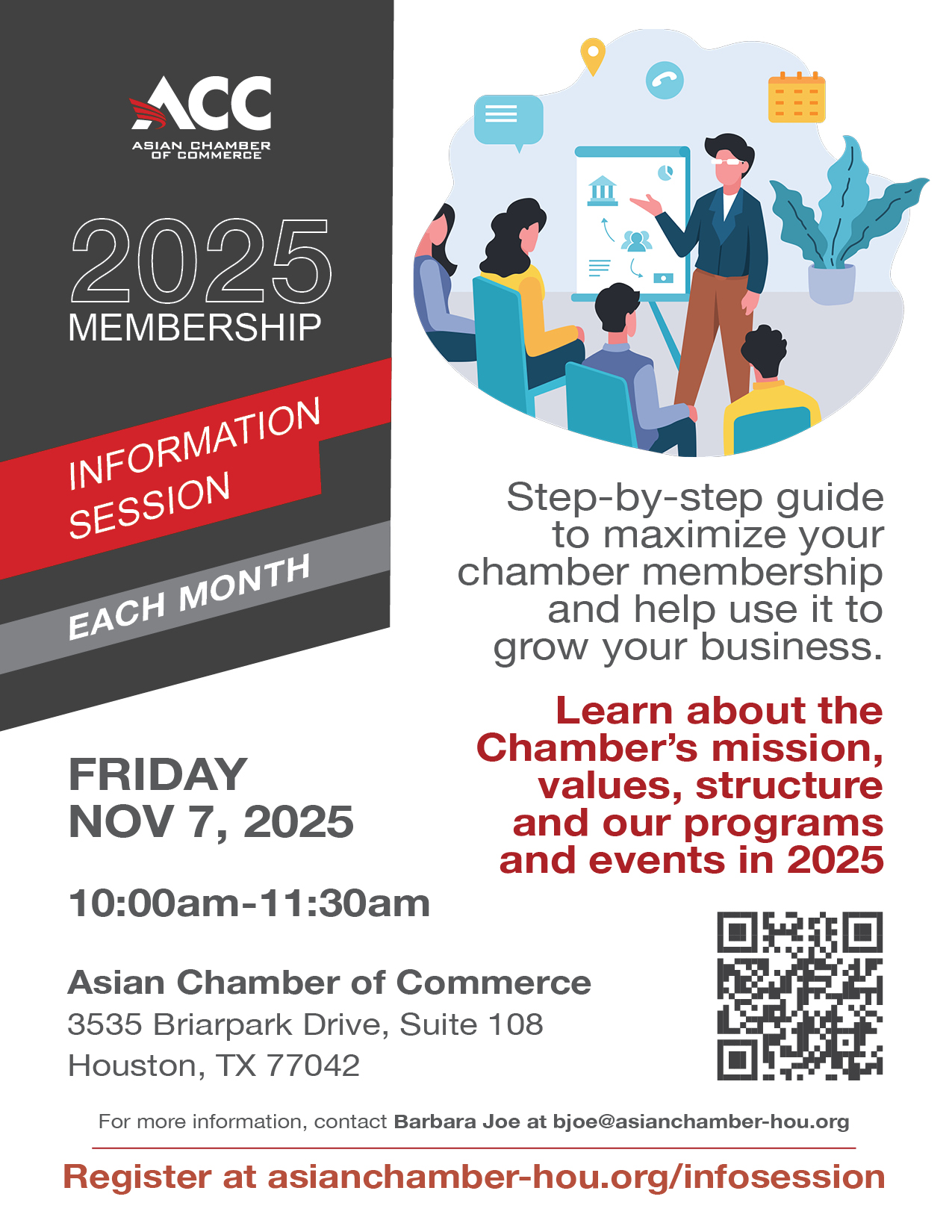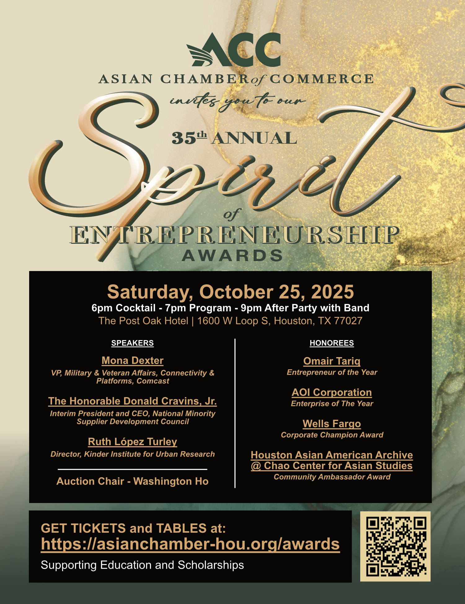 Come join us in celebrating over 35 years serving the Greater Houston Area. Each year, The Asian Chamber of Commerce in Houston recognizes companies and individuals who have impacted our community at large. The event unites the Asian business community to celebrate excellence in leadership, business, and community impact within the greater Houston area.