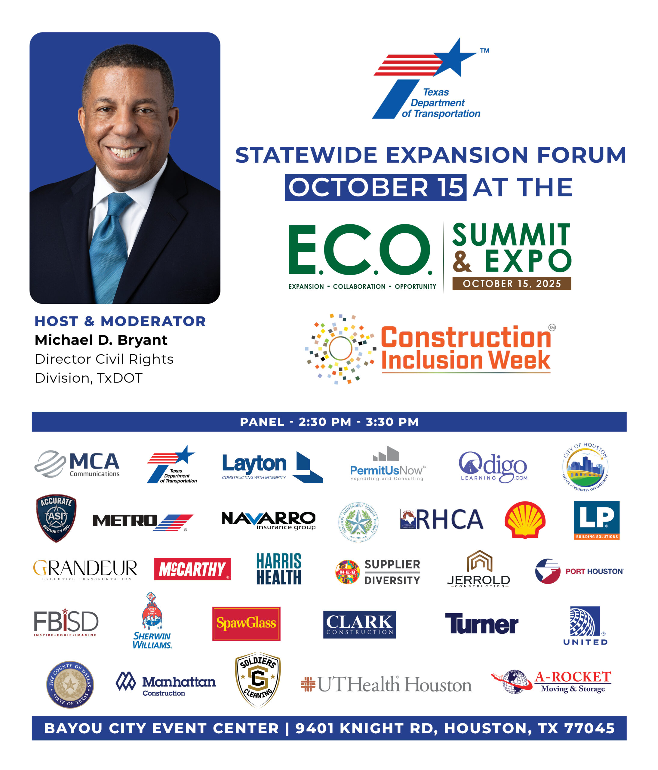 The ECO Summit & Expo will be filled with informative panels and workshops, plus the opportunity to forge meaningful connections with vendors, organizations, prime contractors, and subcontractors. This statewide expo will host over 70 vendor booths, stage talks with agencies and primes, and opportunities to meet primes/GCs/agencies