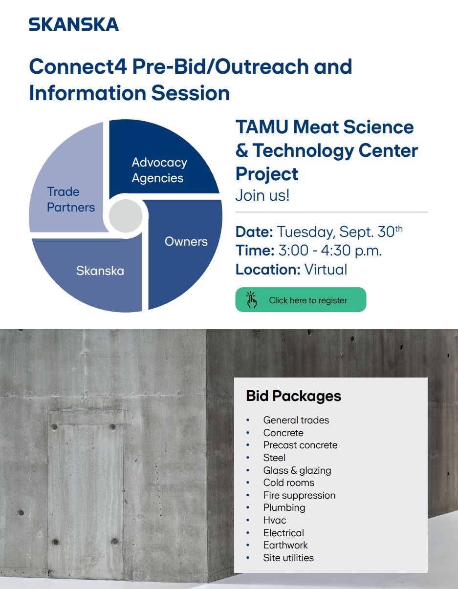 This event will provide an overview of the upcoming Texas A&M Meat Science & Technology Center project, including key milestones and buyout timelines. It’s an opportunity for subcontractors to learn more about scopes of work and how they may participate.