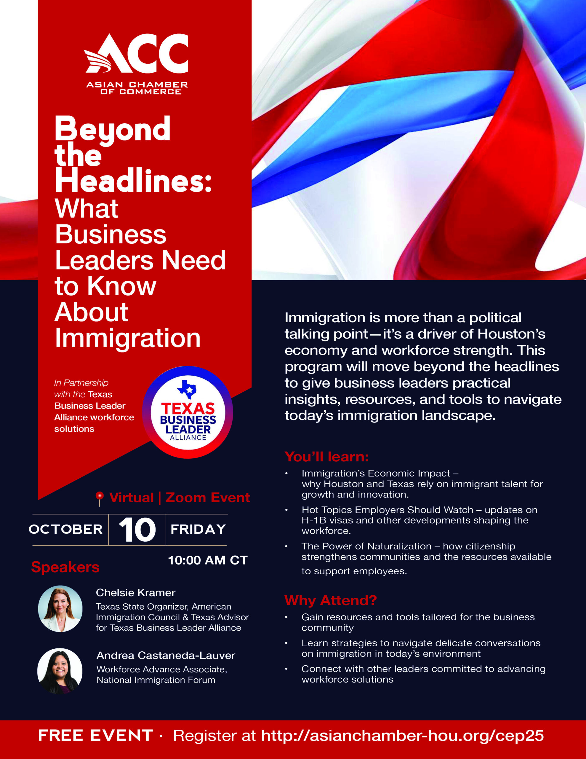 Immigration is more than a political talking point— it's a driver of Houston's economy and workforce strength. This program will move beyond the headlines to give business leaders practical insights, resources, and tools to navigate today's immigration landscape.