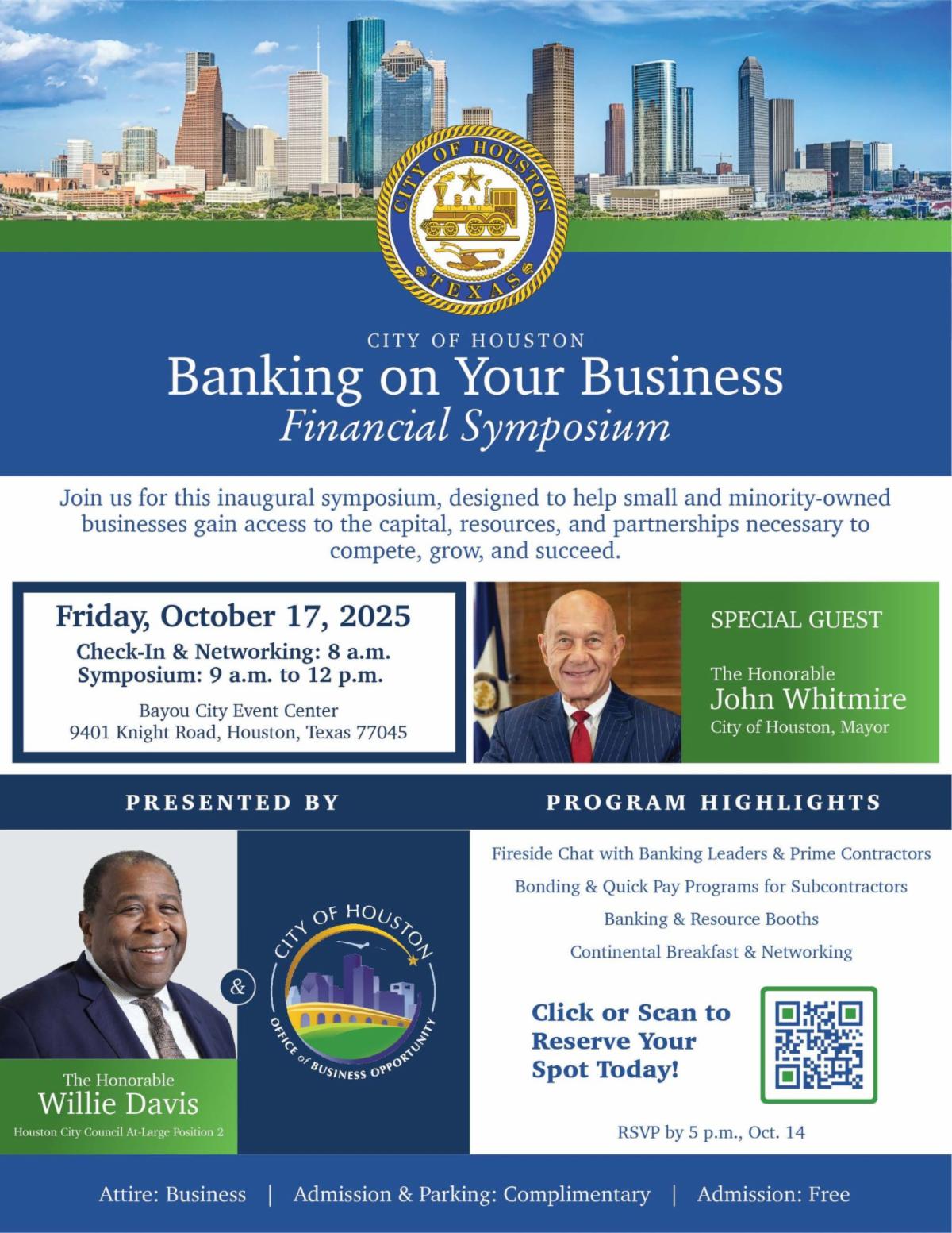 City of Houston Council Member Willie Davis (At-Large Position 2), in collaboration with the Office of Business Opportunity (OBO), proudly invites you to the Inaugural Banking on Your Business Financial Symposium.