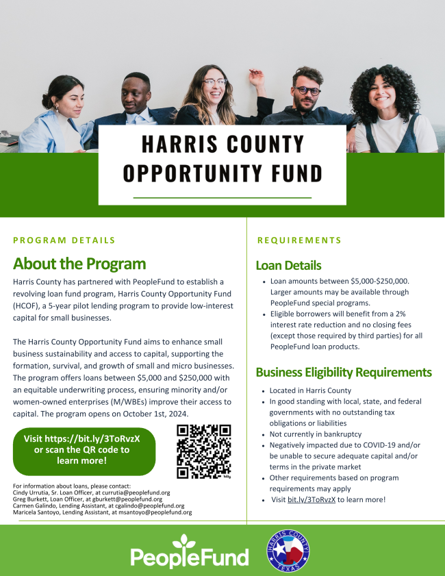 Harris County has partnered with PeopleFund to establish a revolving loan fund program, Harris County Opportunity Fund (HCOF), a 5-year pilot lending program to provide low-interest capital for small businesses. The loans distributed by the Fund will fill an existing gap for small business owners seeking capital for their businesses. The overall goal is to improve small businesses’ sustainability and access to capital, thus aligning with Harris County’s Small Business Priority Outcome to “support the formation, survival, and growth of small and micro businesses.” Under this program, Harris County Opportunity Fund and PeopleFund will provide loans ranging from $5,000 to $250,000 for eligible small businesses through an equitable underwriting process, ensuring minority and/or women-owned enterprises (M/WBEs) improve their access to capital. Additionally, PeopleFund will provide all applicants with access to free technical assistance.