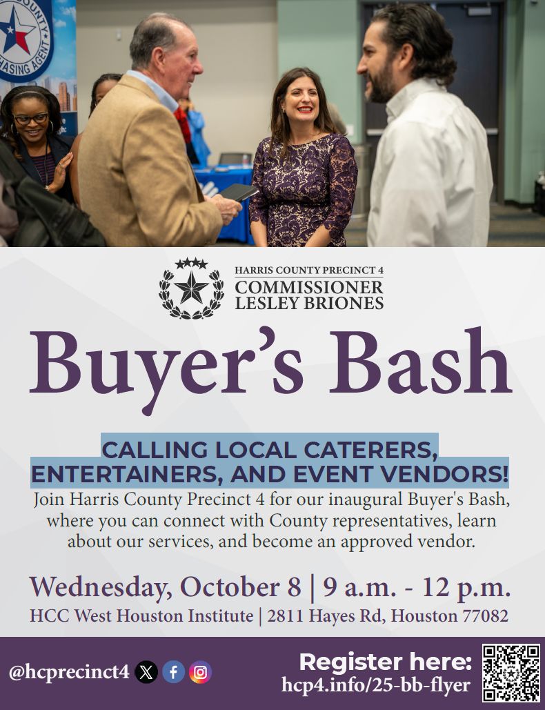 Join Harris County Precinct 4 for our inaugural Buyer's Bash, where you can connect with County representatives, learn about our services, and become an approved vendor.