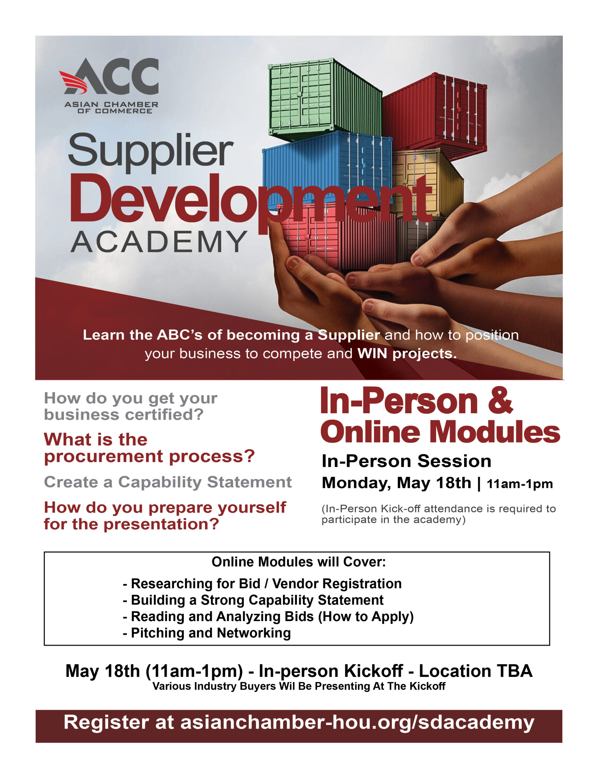 The Asian Chamber of Commerce is hosting our Supplier Development Academy to help your business win bids and learn what buyers look for in selecting suppliers. Be coached by decision makers from mayor corporations and the public sector in researching bids, learning the application process, and how to knock out a winning presentation. Meet Potential Buyers at the In-Person Sessions.