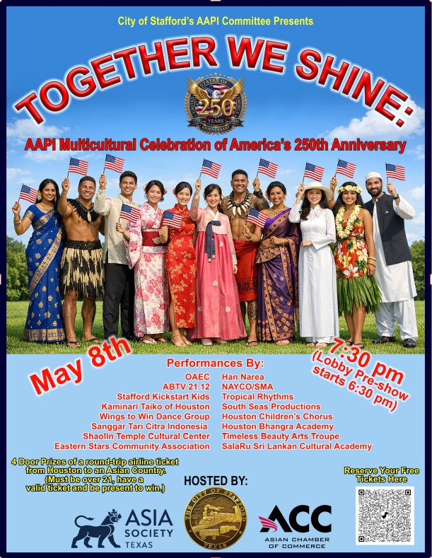 The City of Stafford, in partnership with the Asia Society Texas Center and the Asian Chamber of Commerce, is proud to announce an Asian American Pacific Islander (AAPI) celebration in honor of the 250th anniversary of the United States. This vibrant event will be held at 7 p.m.