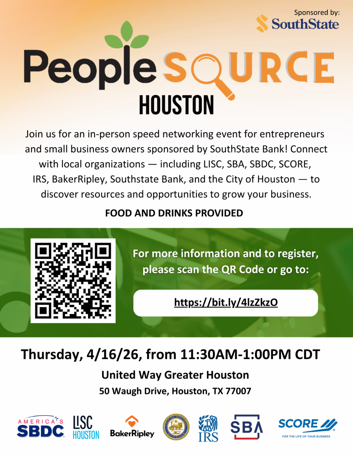 Come join us at this exciting in-person speed networking event for entrepreneurs and small business owners sponsored by SouthState Bank! We will have several local organizations, including LISC, SBA, SBDC, SCORE, IRS, BakerRipley, SouthState Bank, and the City of Houston, in attendance to share available resources, programs, and opportunities to grow and maximize your business. Food and drinks will be provided. Don’t miss out this chance to meet key players in the small business community of Houston!